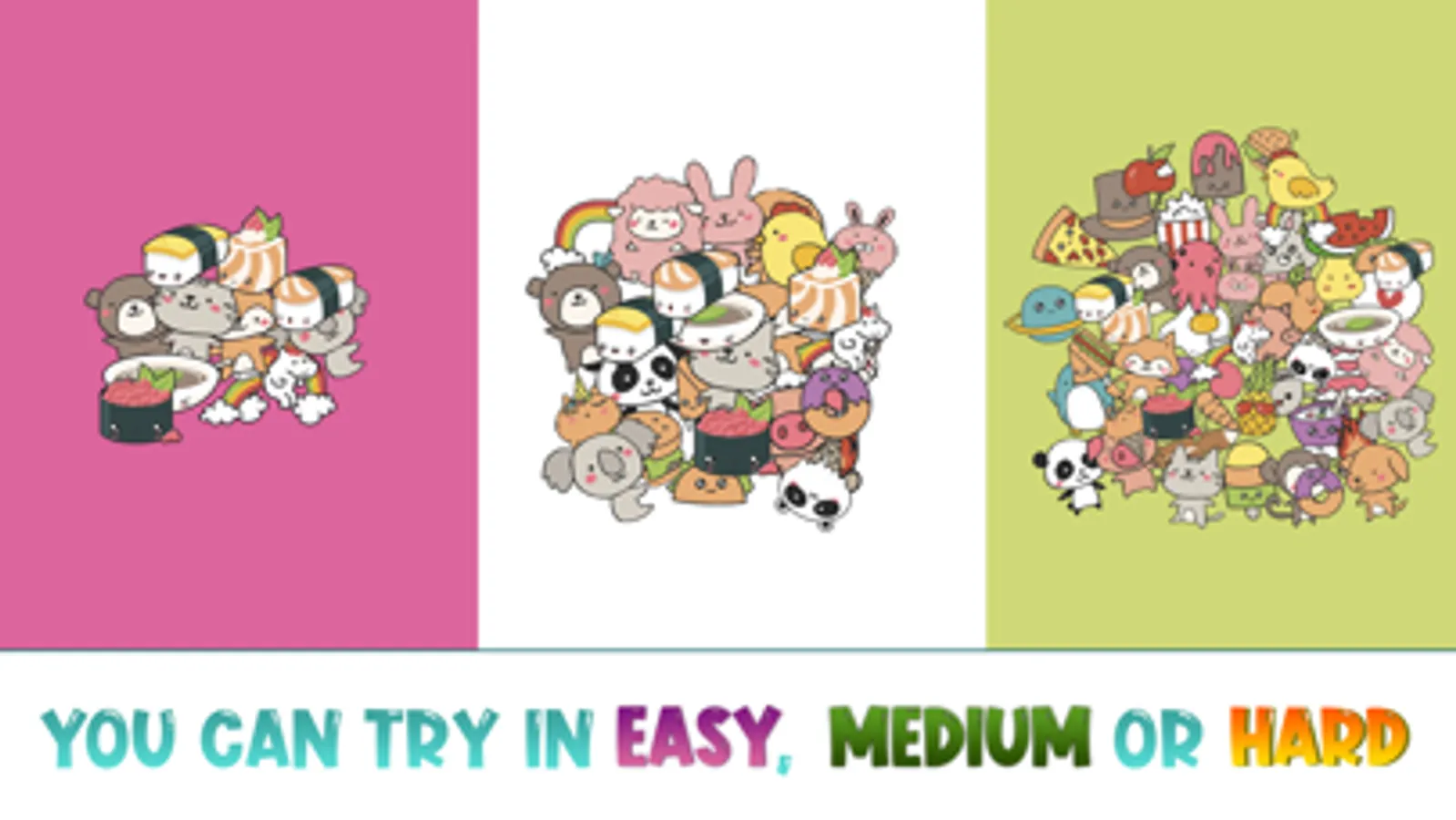 The more objects you find, the more points you get. Enjoy the infinite levels, go as far as you can. Discover the most beautiful drawings of animals, unicorns, ice-creams, sushi, pandas and more! They all look incredibly cute.