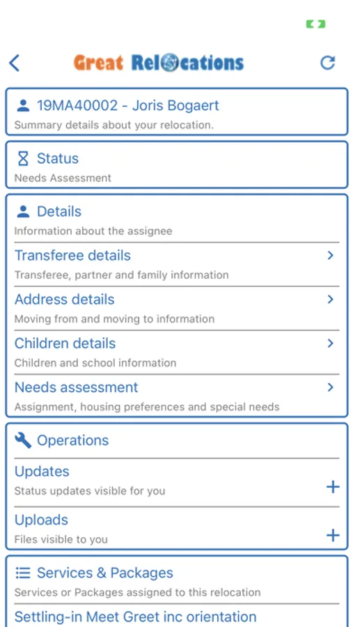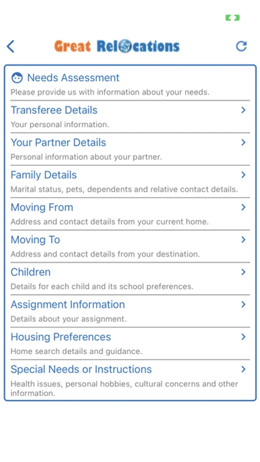 The ReloTracker Mobile App is for relocation providers to send and receive information with transferees and field consultants. It might include a needs assessment questionnaire, required documents to upload, area guides, proposed properties, and other features.