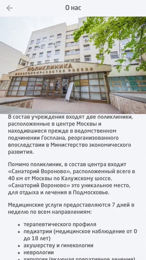 Бесплатное приложение, разработанное специально для клиентов ФБУЗ «Лечебно-реабилитационный центр Минэкономразвития России». Приложение предоставляет возможность получать в реальном времени информацию обо всех событиях лечебно-реабилитационного центра Минэкономразвития России, а также дает доступ к онлайн бронированию и записи на прием к врачу, информации о центре, номерном фонде и расположении ЛРЦ.