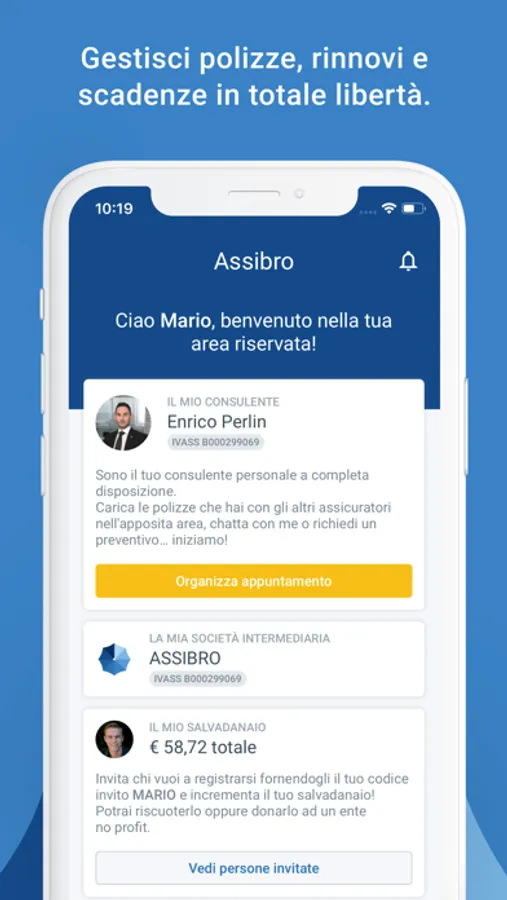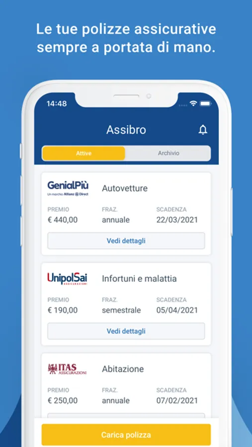 - Caricare le tue polizze in corso (con una semplice foto) per gestirle finalmente tutte in unico posto.
