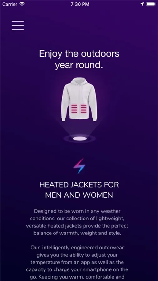 Designed to be worn in any weather conditions, our collection of lightweight, versatile heated jackets provide the perfect balance of warmth, weight and style. Our intelligently engineered outerwear gives you the ability to adjust your temperature from an app as well as the capacity to charge your smartphone on the go. Keeping you warm, comfortable and connected.
