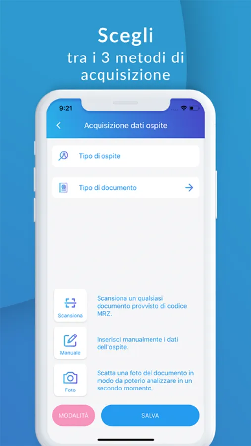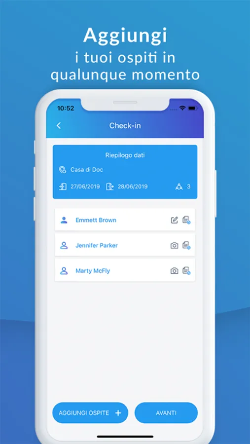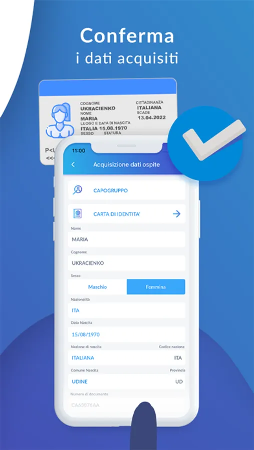 • Di acquisire in meno di 48 secondi i dati dei tuoi ospiti, scansionando i documenti direttamente col tuo smartphone e inviando gli stessi direttamente alla Polizia di Stato, saltando tutta l’estenuante trafila del Portale Alloggiati.