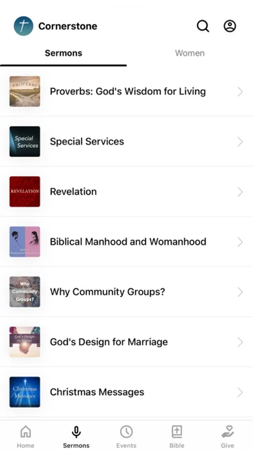 You can use the app to watch or listen to our searchable sermons (both for Sunday morning and Youth Group); view and sign up for Cornerstone events; read or listen to a daily one-year Bible reading plan; give online securely; and more!