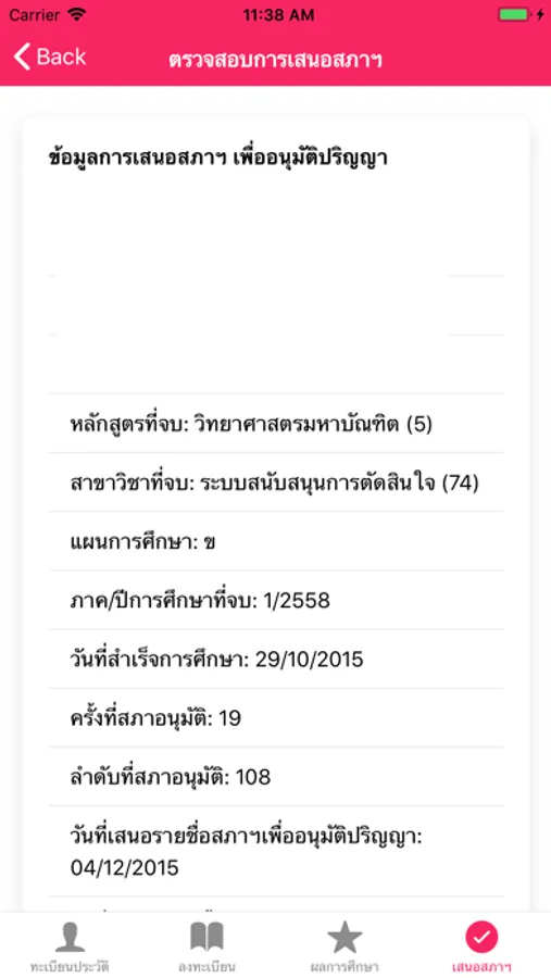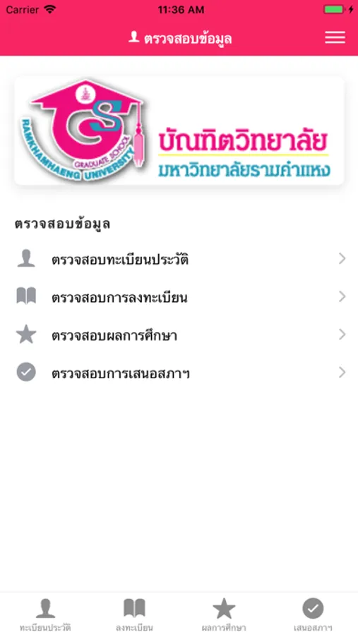 ตรวจสอบทะเบียนประวัติ, ตรวจสอบการลงทะเบียน, ตรวจสอบผลการศึกษา และตรวจสอบการเสนอสภาฯ เพื่ออนุมัติปริญญา ของนักศึกษาปริญญาโทและเอก