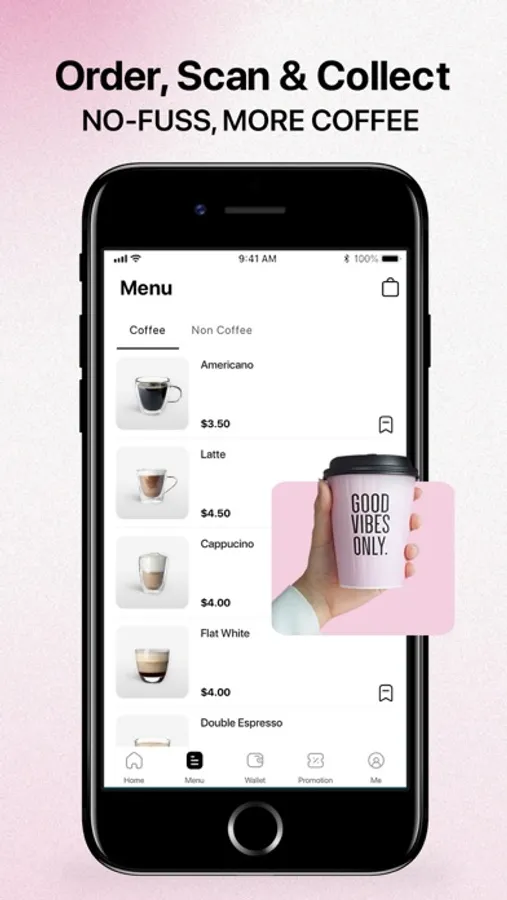 It's easy! Just sign up, order and pay. You'll get a notification once your beverage is ready to be picked up. Say no to queues!