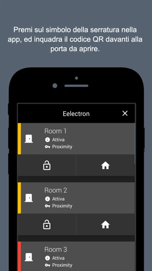 Una volta davanti alla porta della tua camera, oppure per aprire eventuali varchi esterni alla struttura o di accesso a servizi comuni, premi sul simbolo della serratura nella app, ed inquadra il codice QR davanti alla porta da aprire.