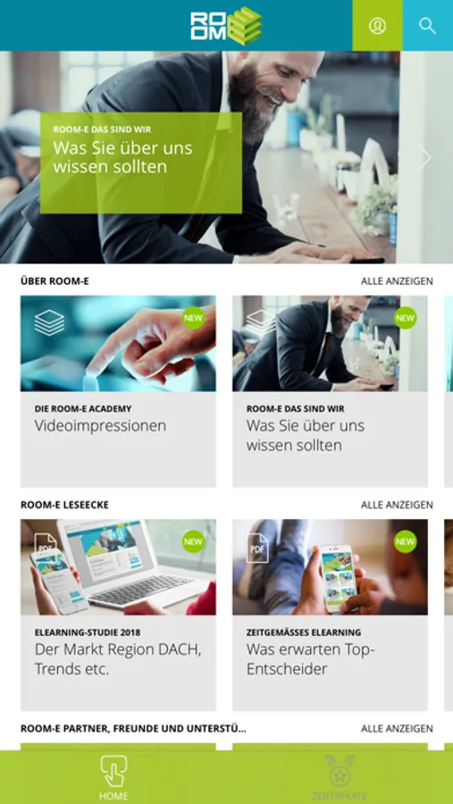 ROOM-E bietet alles, was Sie für den unkomplizierten Einstieg in den Wissenstransfer mit mobilen Endgeräten benötigen. ROOM-E ACADEMY ist das digitale LERN- und CONTENTMANAGEMENT-System per App und Browser, welches schwerpunktmäßig für Themen wie Onboarding, eLearning, Vertriebsunterstützung oder Wissensmanagement genutzt wird. Absolut einfach im Handling sowohl im Front- als auch im Backend, sehr moderne und attraktive Kacheloptik – so macht Wissensmanagement wirklich Spaß.