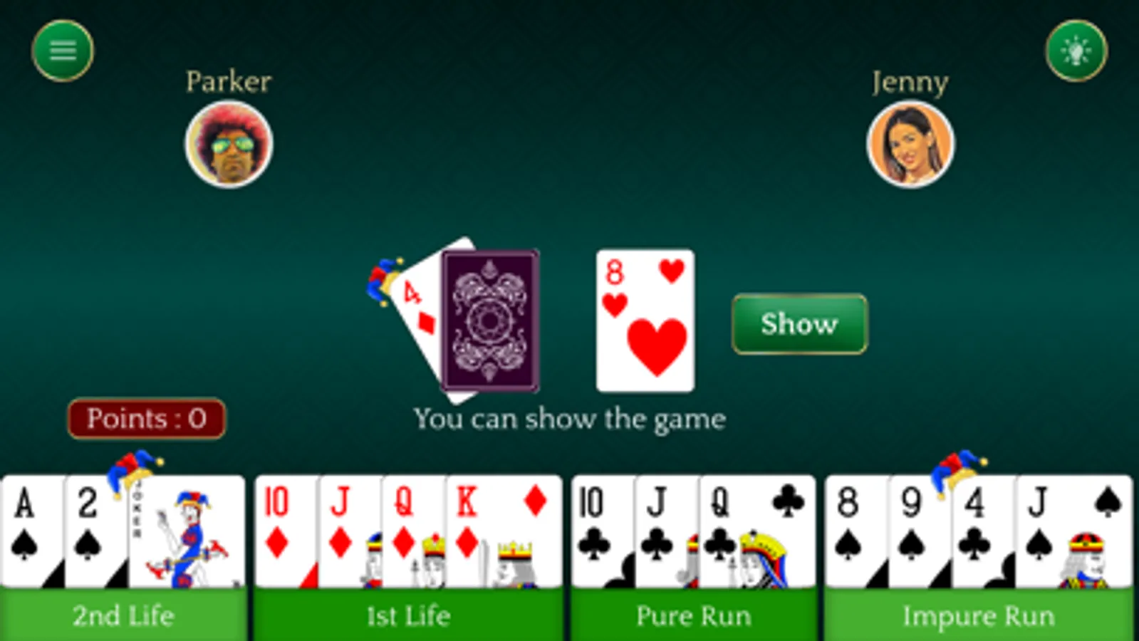 In the beginning, 13 cards are distributed to two or more players. The main objective of the game is to create a pure sequence of cards (example: JQK) of the same suit or set (example: AAA) of cards having equal value. Players take turns to take cards from the faced down deck or the opponents' thrown card. In Indian Rummy, a player must have a pure sequence (First Life), pure or impure Sequence (Second Life), and a set of four cards to show or declare a game. There are Joker cards in the game that can be used to form an impure sequence. After a player declares the game, the sum of the card numbers is counted. If a player is unable to make pure Sequence (First Life), then all of his cards will be counted. If a player can make pure Sequence (First Life), then the rest of the invalid sets of cards will be counted, including the Joker cards. Players are ranked according to the total sum of the card numbers.
