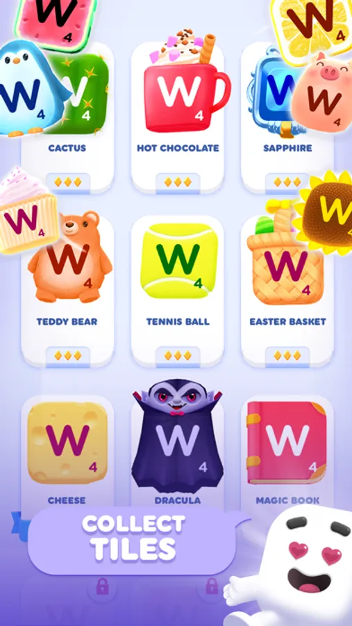 Show off your word game style and skills as you unlock special letter tiles like the cute teddy bear, sushi, or watermelon