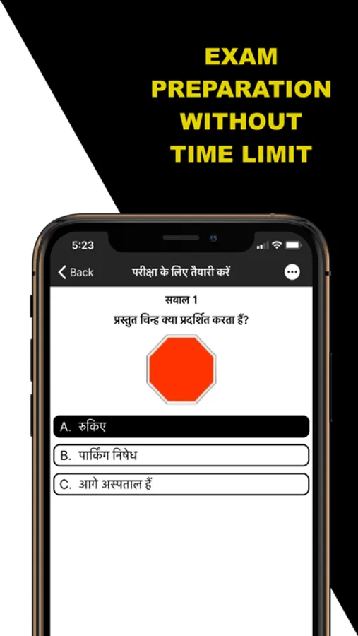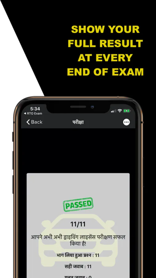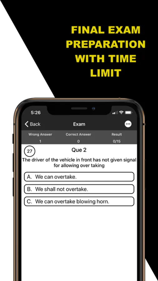 Exactly same as RTO test, random questions and road signs related questions will be asked in this exam. Time limit for each question is exactly same as approved by state RTO Department.