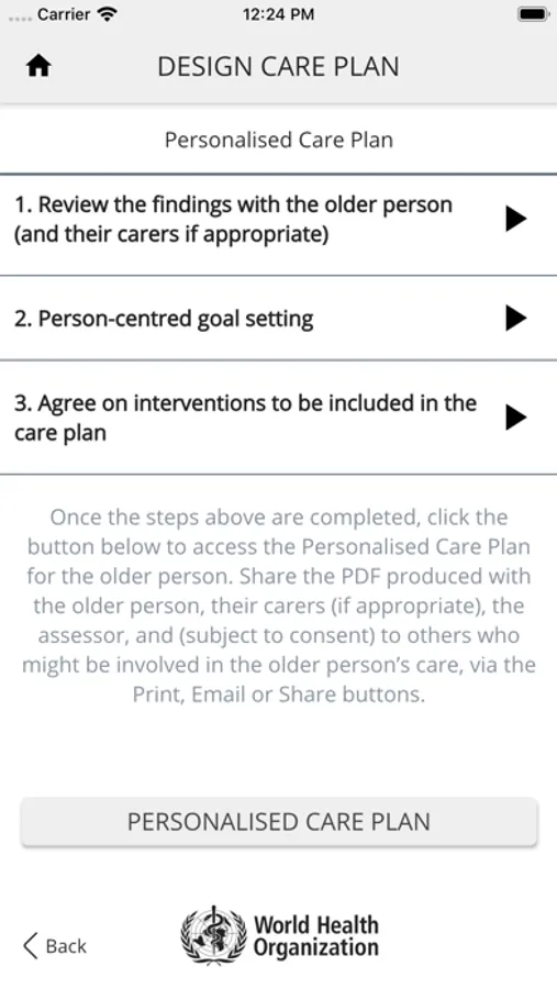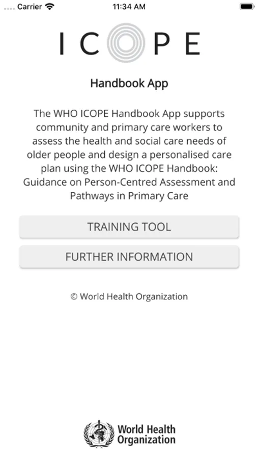 The World Health Organization's ICOPE Handbook App is a digital application that supports the implementation of the Integrated Care for Older People approach (ICOPE). The interactive app guides health and social care workers step-by-step through the process of screening older people at risk of care dependency in the community, undertaking a person-centred assessment of older people’s health and social care needs, and designing a personalised care plan. The app can also be used by governments and organisations to train health and social care workers to deliver personalised care.