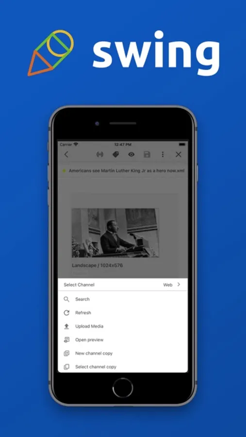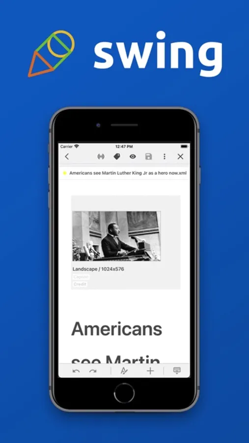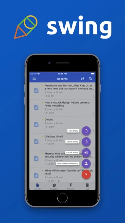 Swing Mobile creates a rich media workspace for users on the move by harnessing the power and ergonomics of the modern smartphone. Using manual or voice input, authors create a story in a simple template, insert photo or video content from their local device or online sources and release the story directly into the editorial workflow.