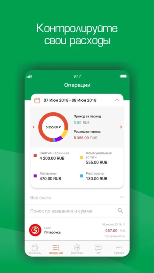 - контроль расходов по всем банковским продуктам в режиме одного окна в разрезе категорий;