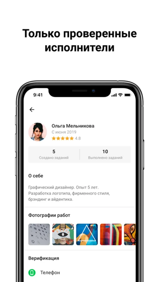 Исполнителям предлагаются широкие возможности для проработки своего профиля: публикация кейсов, наработка рейтинга с помощью выполненных заданий и отзывов, возможность указать свое местонахождение.