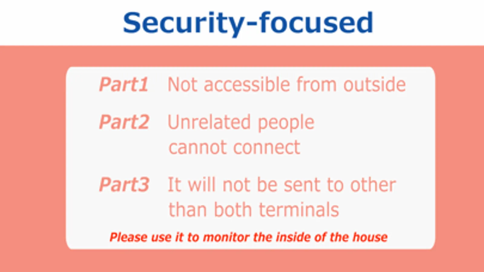 With P2P terminal-to-terminal communication, there is no need to connect to the Internet and there is no need to worry about video and audio leaking to the outside.