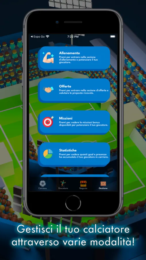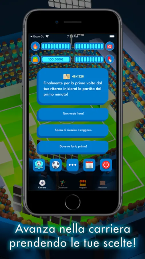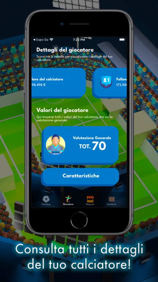 In CHAMPIONS: The Football Game gestirai un calciatore ed avrai il compito di farlo crescere, scegliere cosa fare in moltissimi scenari, allenarlo, potenziarlo e fare trattative, completare missioni e far aumentare i followers sui social!