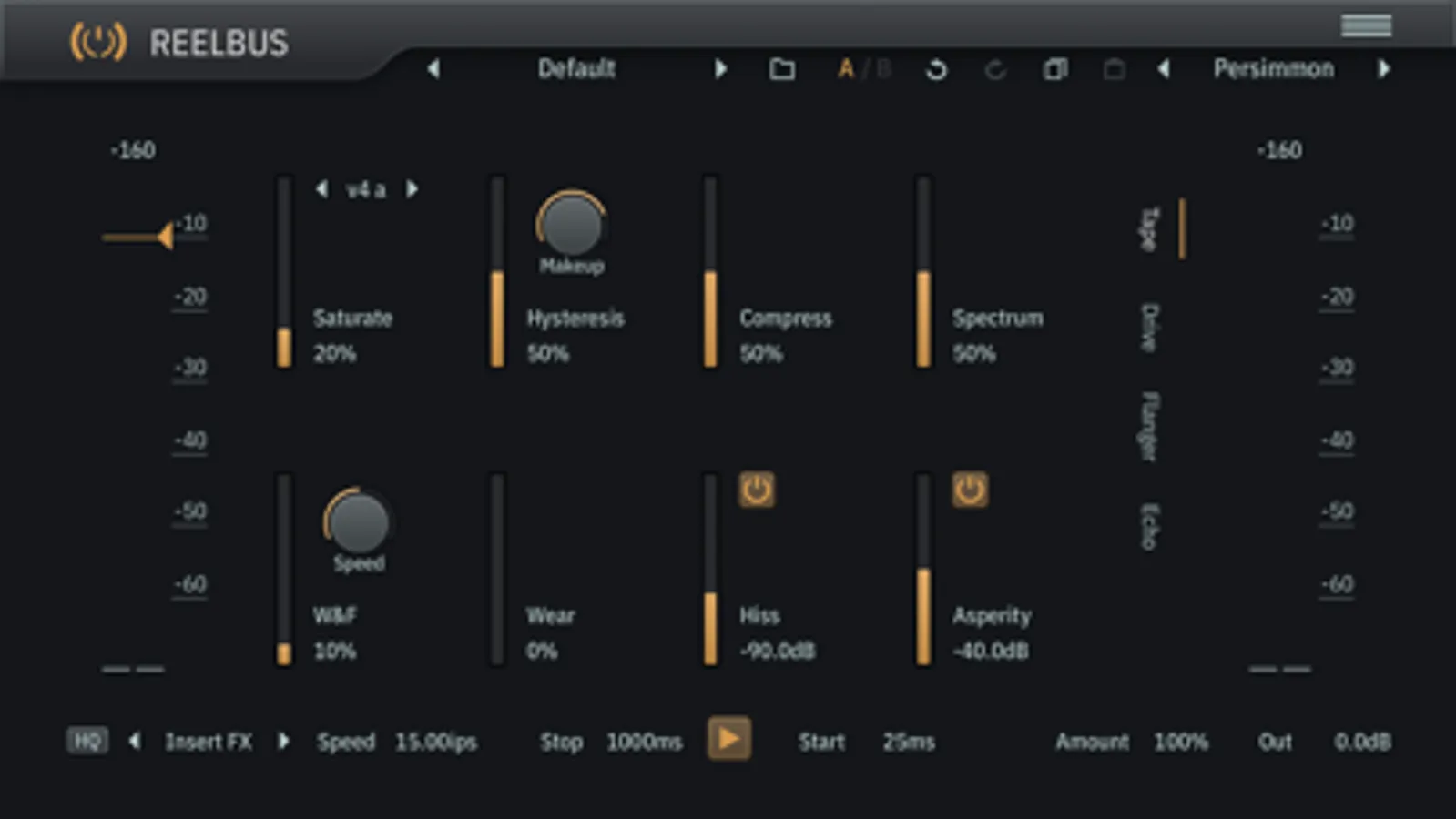 - Saturation, hysteresis, wow and flutter, tape hiss, asperity noise controls