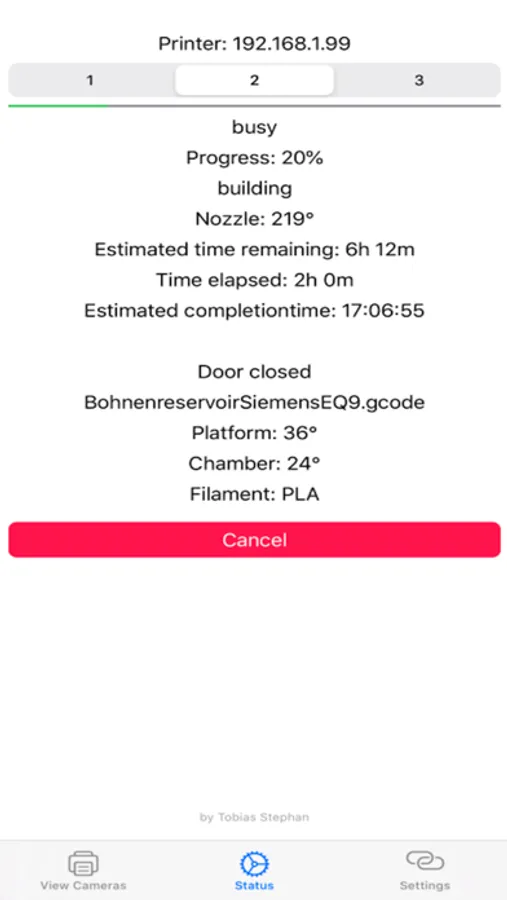 With this app you can watch 3 Dremel 3D40 or 3D45 printers create your 3D objects. There are also detailed status messages, such as a time calculation until the object is finished or the possibility to cancel a print. This is especially useful when you want to check at a glance that everything is okay during the printing process. The advantage is that you can intervene in time to create the object in perfect shape. Just enter the internal IP address of the device under the settings and you're ready to go. You can use the settings on your Dremel to set a local IP address or use the automatically assigned V4 IP address. You can find the IP address of your Dremel 3D40 or 3D45 in the settings. The status display contains information about progress, nozzle temperature, time, open or closed doors, platform temperature, chamber temperature, print file name and file type. In this new version, you can switch the temperature display between Celsius and Fahrenheit.