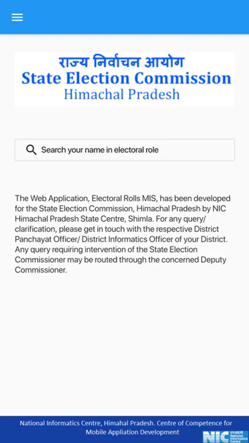 State Election Commission, Himachal Pradesh holds the Elections for Panchayati Raj Institutions and Urban Local Bodies in the state. The Electoral Rolls are prepared by the respective Electoral Registration Officers (SDMs) and Assistant Electoral Registration Officers (BDOs) under the superintendence, direction and control of the State Election Commission using ERMS software. These Electoral Rolls are prepared Ward/Polling Station wise and are published on the web after each revision. The app helps electors of the state to search their name in these rolls to find out the exact details of their vote. They are provided with the District, Block/ULB, Ward, Polling Station (wherever valid), relative name, age, EPIC number, House No, their ward and ward extent etc.