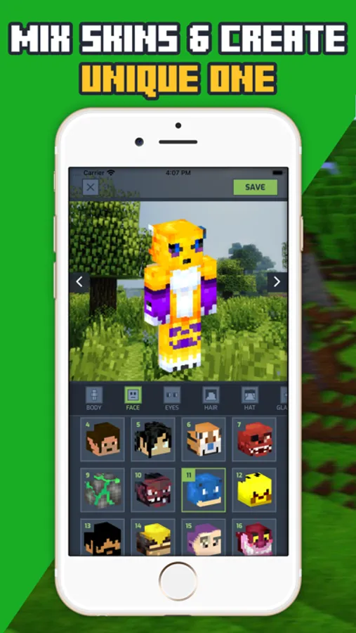 This is not just a simple skin creator or a skin app. Here you can choose from thousands of all done parts of the skin a made your own mix. You can mix: the hat, hair style and color, mouth, nose, arms, legs, jackets, much more... We have 5 categories of all done skins: Enderman, Boys, Girls, Superhero and Anime.