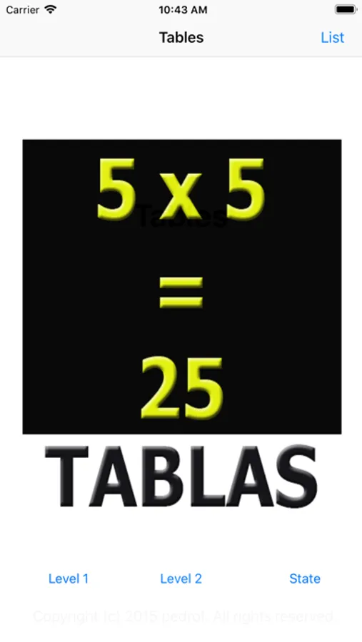La app tiene dos niveles, en el nivel 1 te hace 5 preguntas con números del 1 al 5 y el nivel 2 del 1 al 10, para que pongas a prueba tu conocimiento de las tablas de multiplicar.