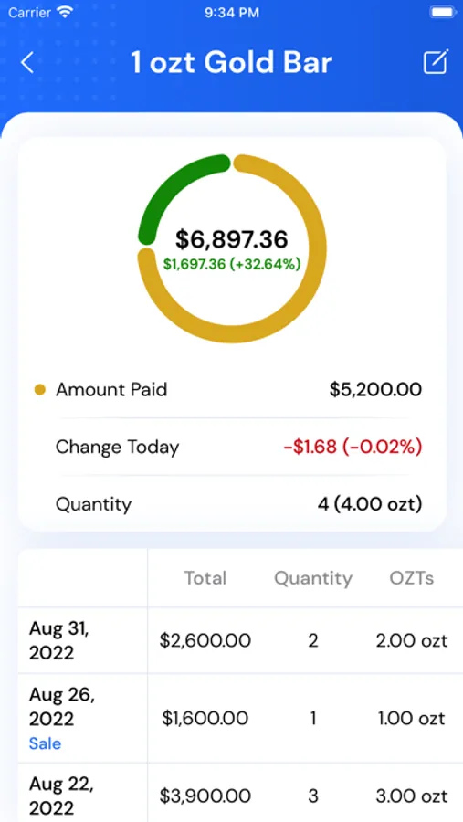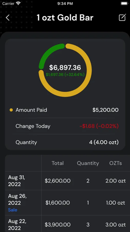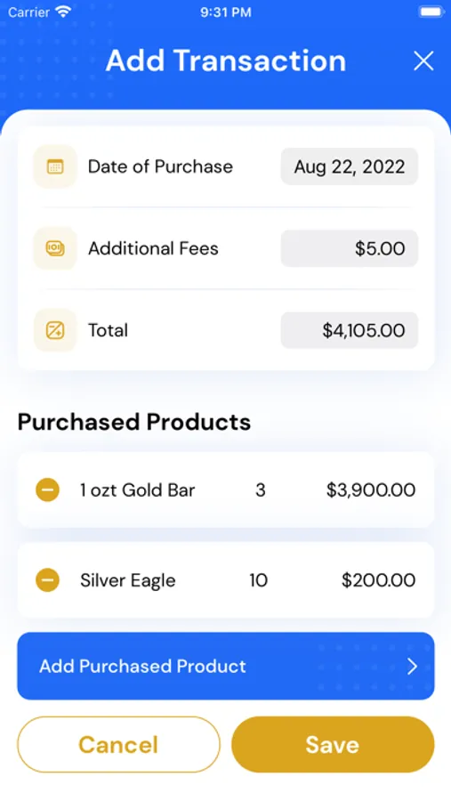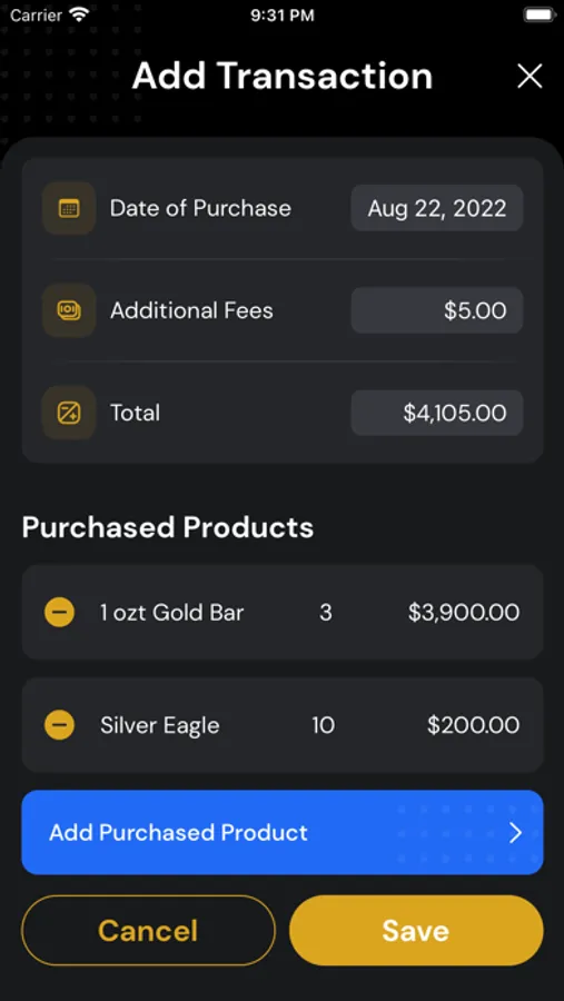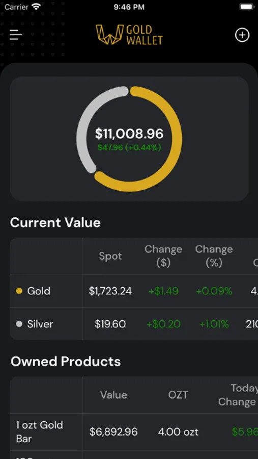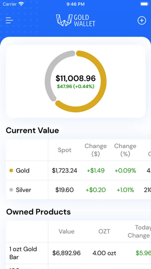 Simply add each purchase to the app when you make it, and let Gold Wallet do the rest. Gold Wallet will tell you the current value of each product that you have purchased, your profit, and the quantity that you own.