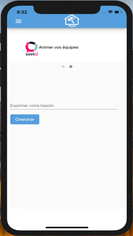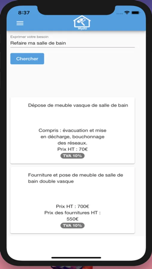 - la première page permet de rechercher le coût d'une prestation grâce à une barre de recherche. Exemple : "Pose d'une cuisine"