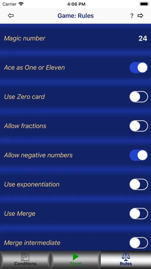 Different extensions to the game rules are available. For example, you may allow One (ace) to stand for either one or eleven in order to enlarge the variety of solvable combinations, so, for instance, "1 1 2 3" gets a solution: 11×2+3-1. Other available options are common fractions, exponentiation (raising to power), "merge" operation (writing one number after another) and presence of Zero card (Joker). Even "magic number" 24 can be changed to a different value!