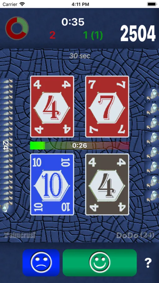 DoDo24 allows playing with one or two short (40) of full (52) packs of cards. The application also provides training mode as well as an option to enter own puzzles.