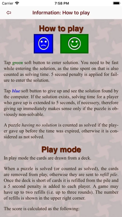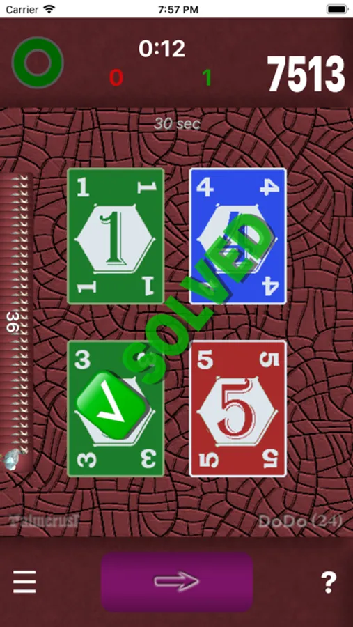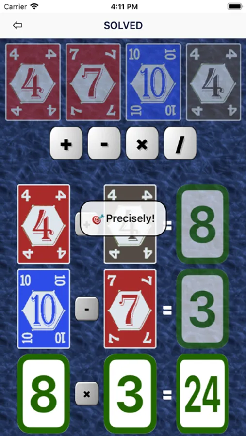 This version of game "24" encourages fast thinking. The score depends not only on the number of solved puzzles but also on the time spent on solving. If a combination has no solution, a player who figured that out is rewarded as if the puzzle is solved.