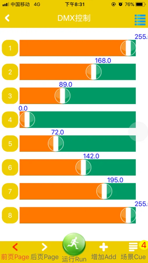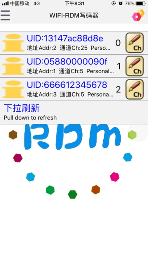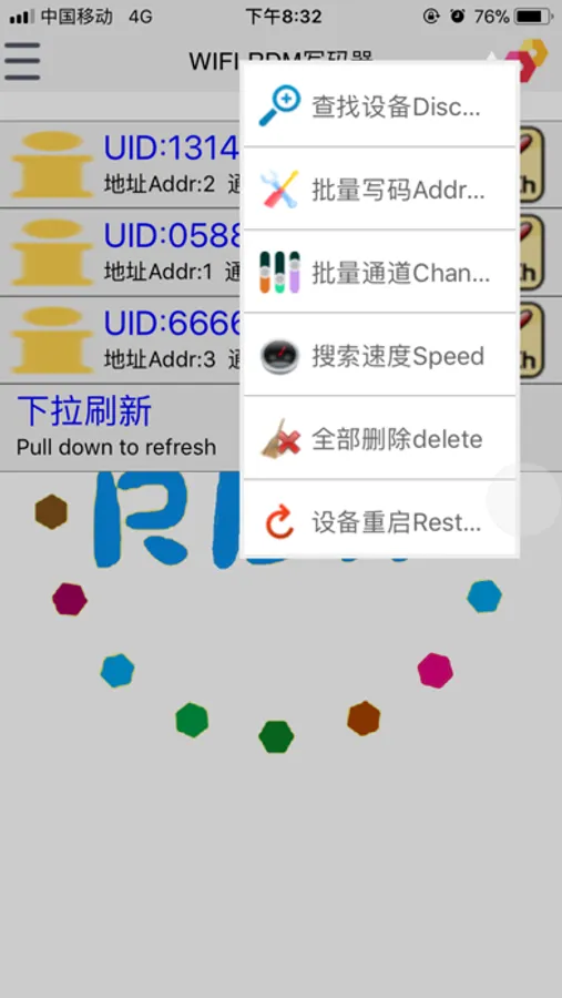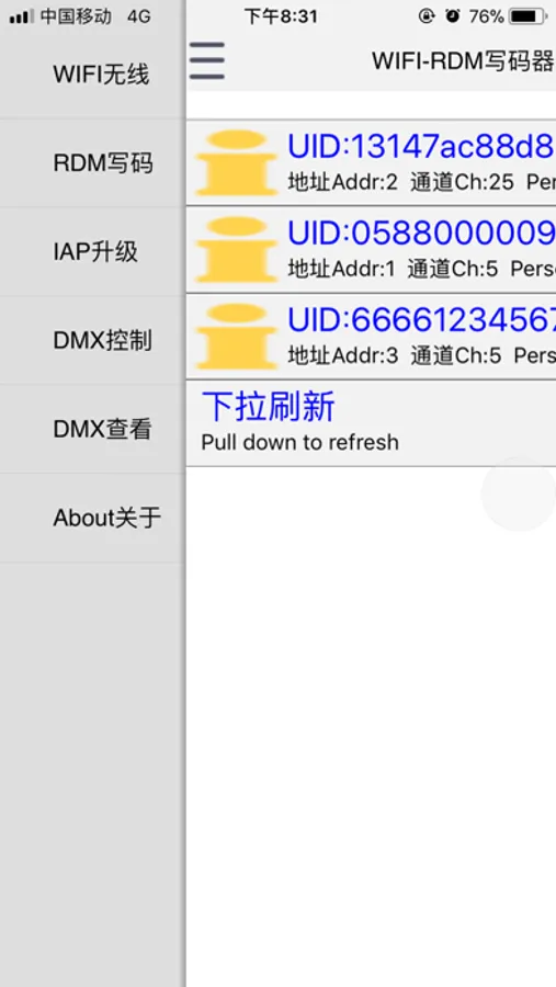 手机app通过WIFI-RDM控制器对标准RDM协议舞台灯写码。