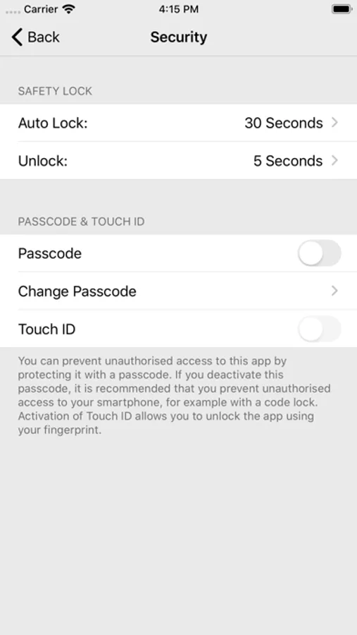 To lower the likelihood of unintended movements the is locked after an adjustable timeout period. The app comes with its own lock function. Instead of this lock function the build-in lock function of the device can be used. If you want to use the build-in lock function of your device you need to enable if inside this app.