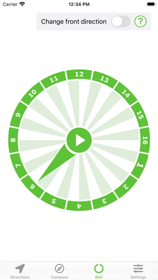 Position mode: In the "Position" mode, each of the 16 vibration units of the feelSpace naviBelt can be selectively activated. For example, if the direction arrow on the screen points upwards to number 1, the vibration is permanently located at the front of the belly, no matter how the belt wearer turns.