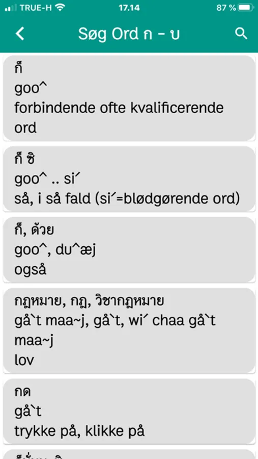 Ordlisterne gør det muligt at slå et thai ord op efter dets lyd og tone uden kendskab til den særlige thailandske skrift. Man kan enten søge efter danske ord, thai ord eller thai lydskrift. Eller man kan uden brugt af tastatur blot angive ords begyndelsesbogstav og få vist en liste af alfabetisk sorterede ord med det angivne begyndelsesbogstav.
