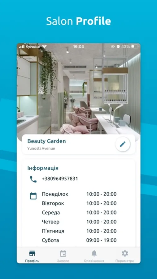 Opening hours, location, contacts, beauty professionals, service catalog, prices, current offers.