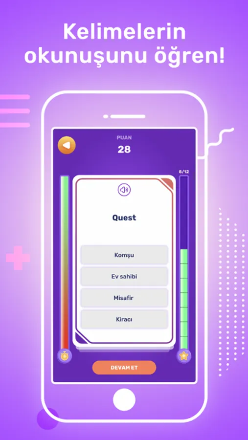Hız Yayınları İngilizce Kelime Yarışması ile yarışarak isterseniz Genel İngilizce konusunda kendinizi geliştirebilir, isterseniz okullarda, yazılılarda, sınavlarda ve testlerde karşınıza çıkan tüm İngilizce kelimeler ve kalıpları tekrar edebilirsiniz. 2, 3, 4, 5, 6, 7, 8, 9, 10, 11 ve 12. sınıfların müfredatındaki tüm kelimeler ve kalıplar bu yarışmada karşınıza çıkacak. Hem puan kazanıp diğer öğrencilerle yarışabilirsiniz, hem de sınavlarda bu kelime ve kalıpları daha rahat hatırlayıp kolayca cevaplayabilirsiniz. Offline (çevrimdışı) veya online (Çevrim içi) kullanılabildiği için İnternet olmadığı zamanlarda bile (metroda, gemide, uçakta) istediğiniz kadar tekrar edebilirsiniz.