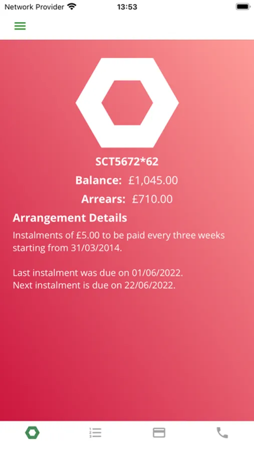 The app shows the amount owed, what has been paid (including date and amount), payment arrangement details and what is outstanding, with user-friendly colour coding: