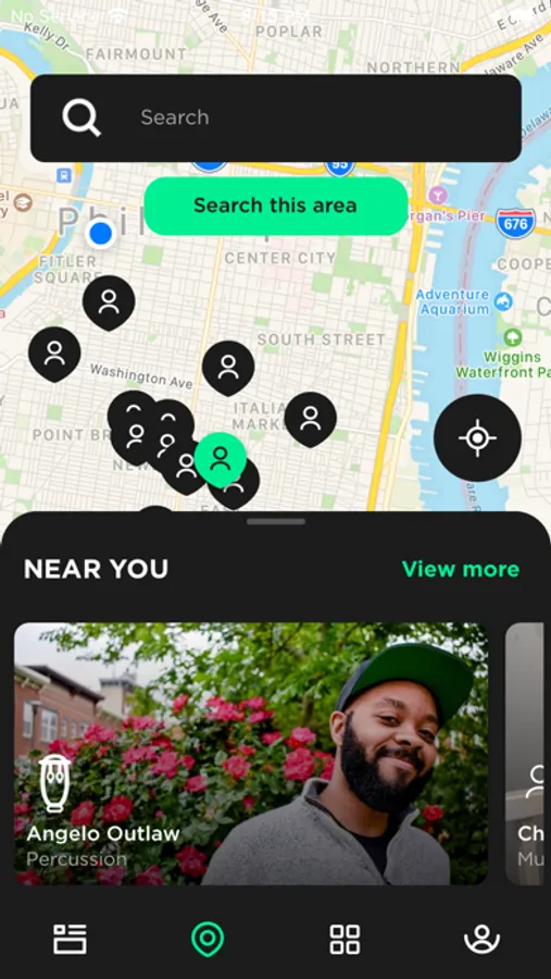 EXPLORE page with a real-time map view showing nearby collaborators just a tap away