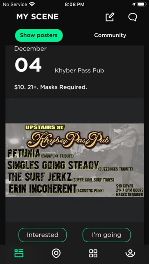 MY SCENE page featuring community and show poster feeds to keep you connected to your scene