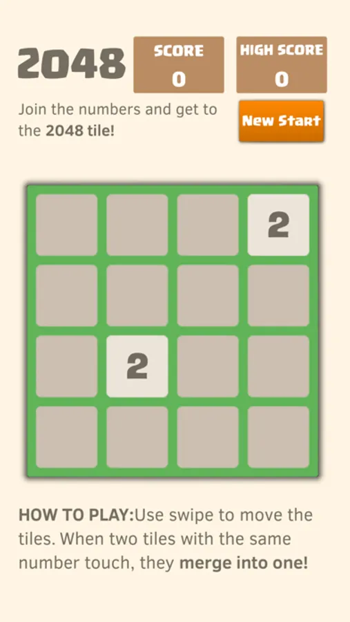 Swipe to move all tiles. When two tiles with the same number touch, they merge into one.