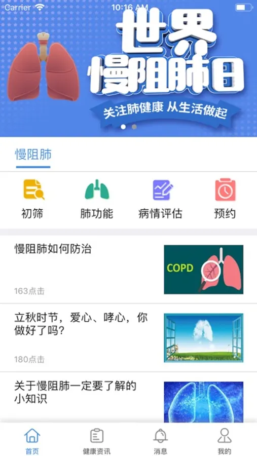 慢阻肺之家APP能帮助用户了解健康知识,以及管理自己的健康,主要功能有:初筛,肺功能,病情评估,预约