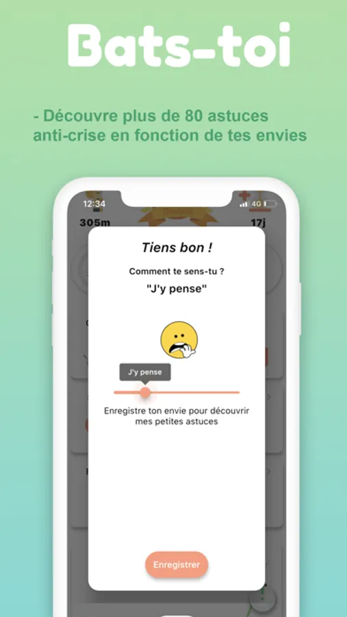 Ouiquit c'est aussi un distributeur d'astuces intelligent qui pourra te proposer plus de 80 astuces anti-crise (méditations, exercices, activités etc) en fonction de l'intensité de tes envies et tout cela simplement en secouant ton smartphone !