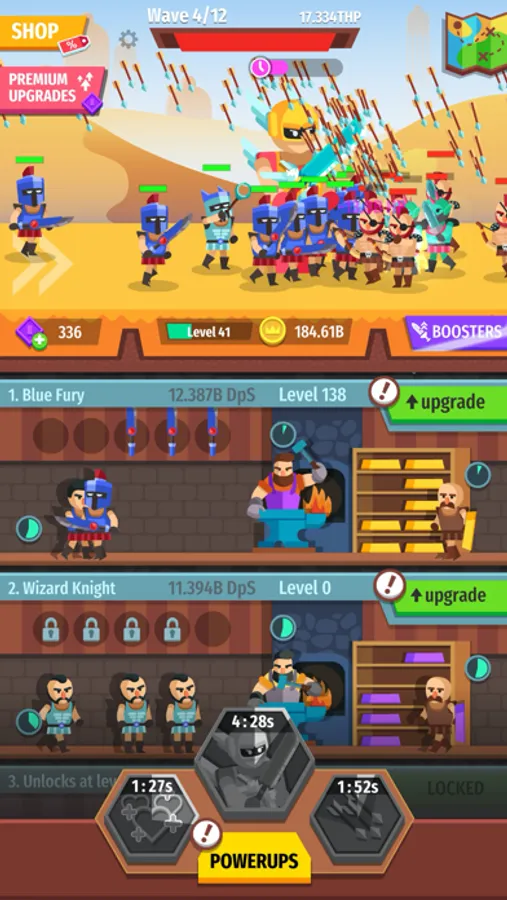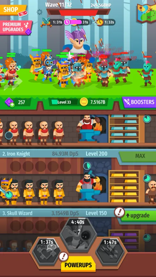 Train and hire blacksmiths so we can equip our warriors with the best weapons we can craft. As you improve your idle forge, our troops will get epic gear to put in their inventory slots - new armour for health, new swords for attack, new staves for magic.