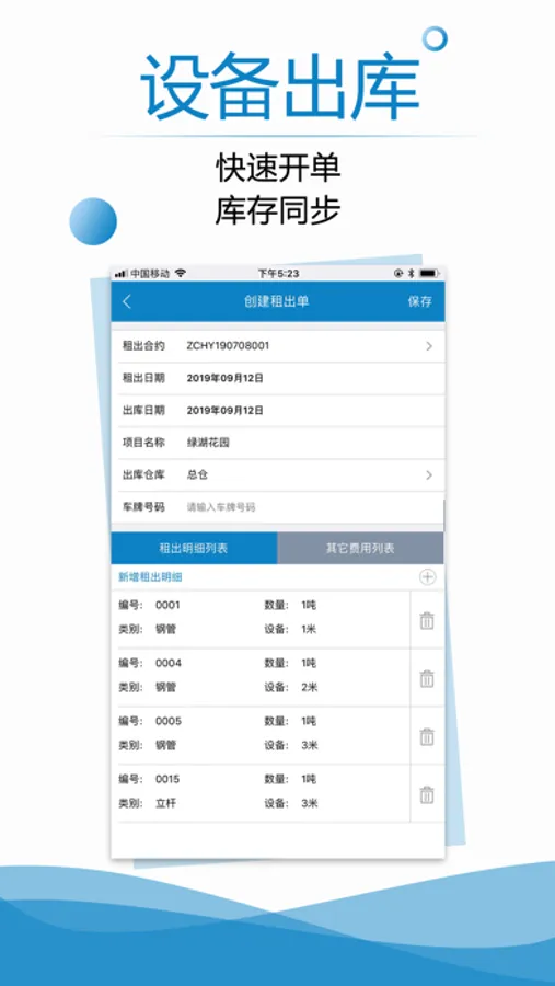 遇上春节连休工地停工,或设备维修保养需要停止作业时。业务员可以在工地现场核实报停材料/设备的数量,以及报停时间。然后通过建材租赁管理APP开单申请报停。费用结算时软件自动扣减相应的费用,提高工作效率。