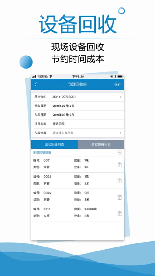 租赁公司员工可以拿着手持机到工地现场进行材料/设备的回收开单,现场检查盘点材料设备的数量与丢损。手机确认材料设备回收的数量,数据即时上传到服务器,并且对接蓝牙打印设备打印回收单给客户。