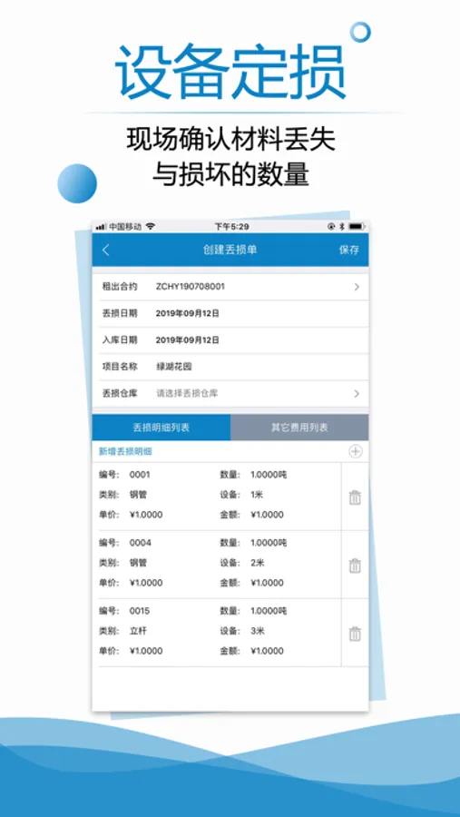 业务员在材料/设备回收前,可以通过手机APP在现场给客户进行材料/设备的定损,确认材料丢失与损坏的数量,根据不同的丢损类型进行定损赔偿。数据自动同步到服务器,可以统一打印到客户的结账明细报表上。