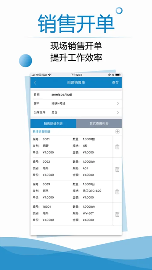 业务员可以通过手机在仓库或工地完成销售和租转售业务。设置材料设备销售单价以及型号,编辑销售数量。销售后自动减少库存,可以打印单据。