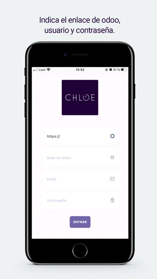 Chloe solo requiere la conexión a un servidor de Odoo 11. Podrás acceder indicando la web, el nombre de la base de datos, el nombre de usuario con el que te conectas en el Erp y la contraseña, una vez indicada esta información accederás a la app.
