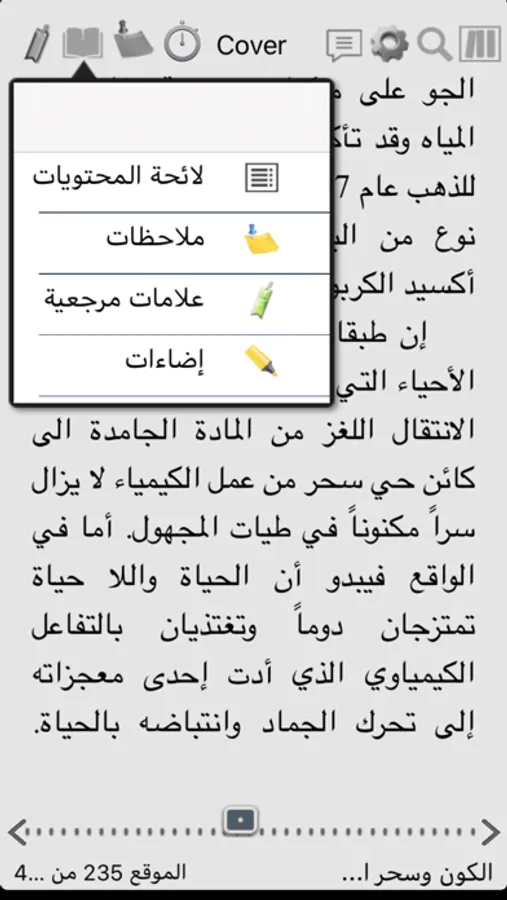 كما يمكنك الضغط على لائحة المحتويات في رمز الكتاب للانتقال إلى الفصل الّذي تريد قراءته، أو استخدام الشّريط الظّاهر أسفل الشّاشة للانتقال إلى الصّفحة الّتي تريد مطالعتها.