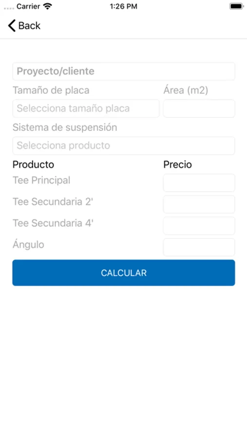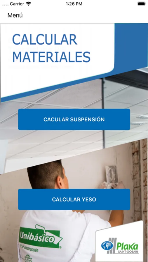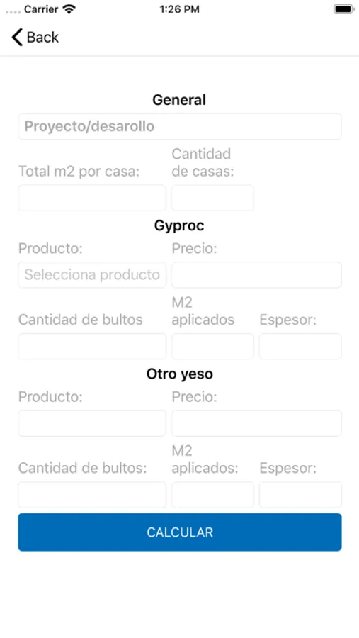 Al iniciar la aplicación se puede realizar el cálculo de la cotización de una suspensión o de un yeso, en cualquiera de las dos opciones se debe llevar acabo el llenado del formulario y una vez realizado puede compartir el resultado.